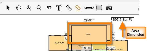 Use area dimensions to annotate the plan with edge (wall) lengths and area size. To annotate the plan with an area dimension, select the Add Area Dim tool from the editor toolbar. Area dimensions can be shown or hidden and locked or unlocked. They can also be deleted all at once. To edit an area dimension select it, and drag any of the edge points to the desired location. You can add an additional corner (breakpoint) to an area by clicking on an area dimension edge while pressing the <Ctrl> key. See Adding a Corner to a Wall for more information which also applies to adding area dimension breakpoints.