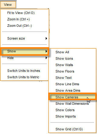 | 2. | Then select Show Cameras from the Show sub-menu which pops up to the right. |