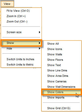 Color display for icons and floors is enabled by default. This feature can be disabled and the display of colors that have been assigned to these items can be suppressed using the Hide Colors command. To return to the default where colors are displayed, select the Show Colors command.